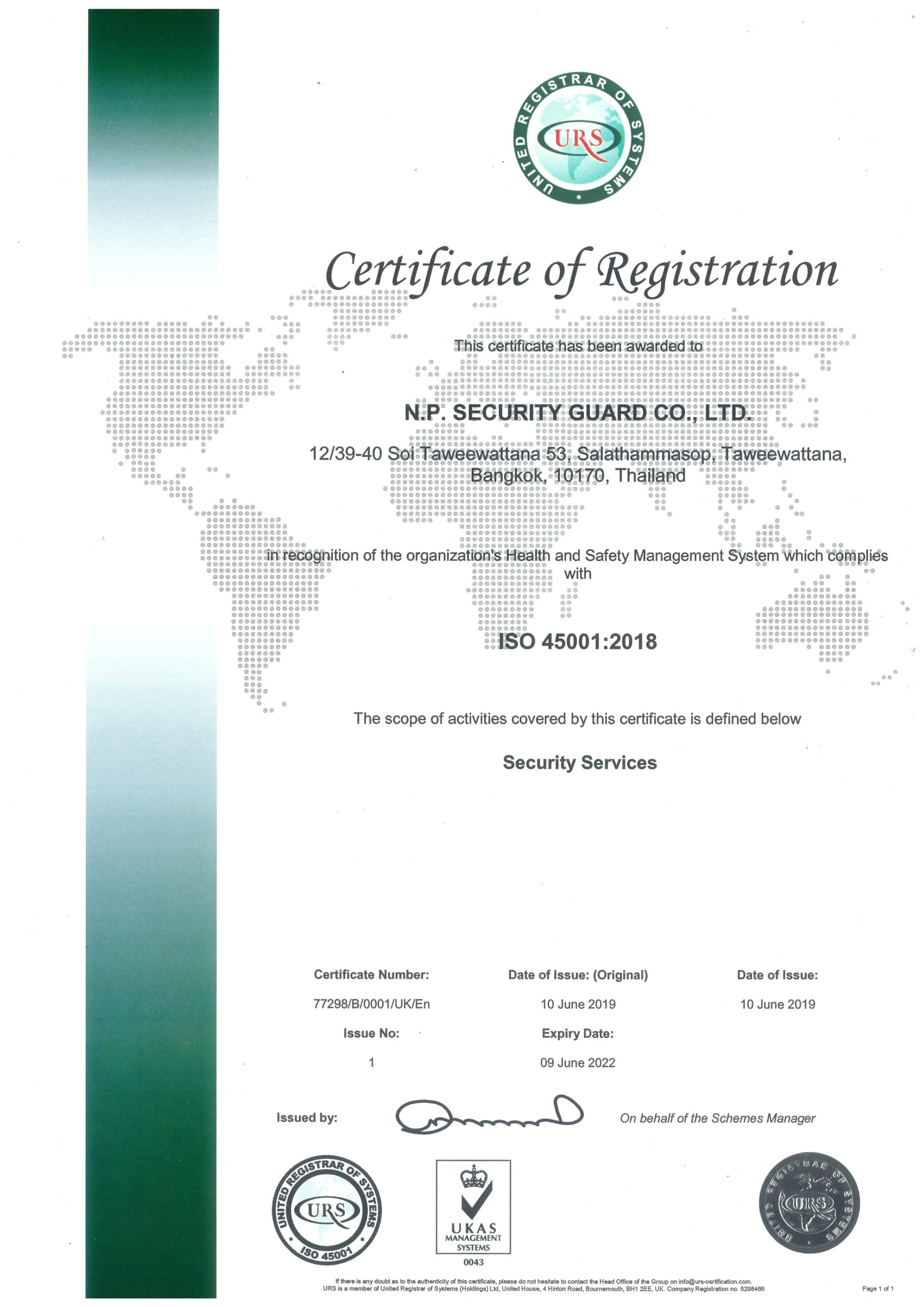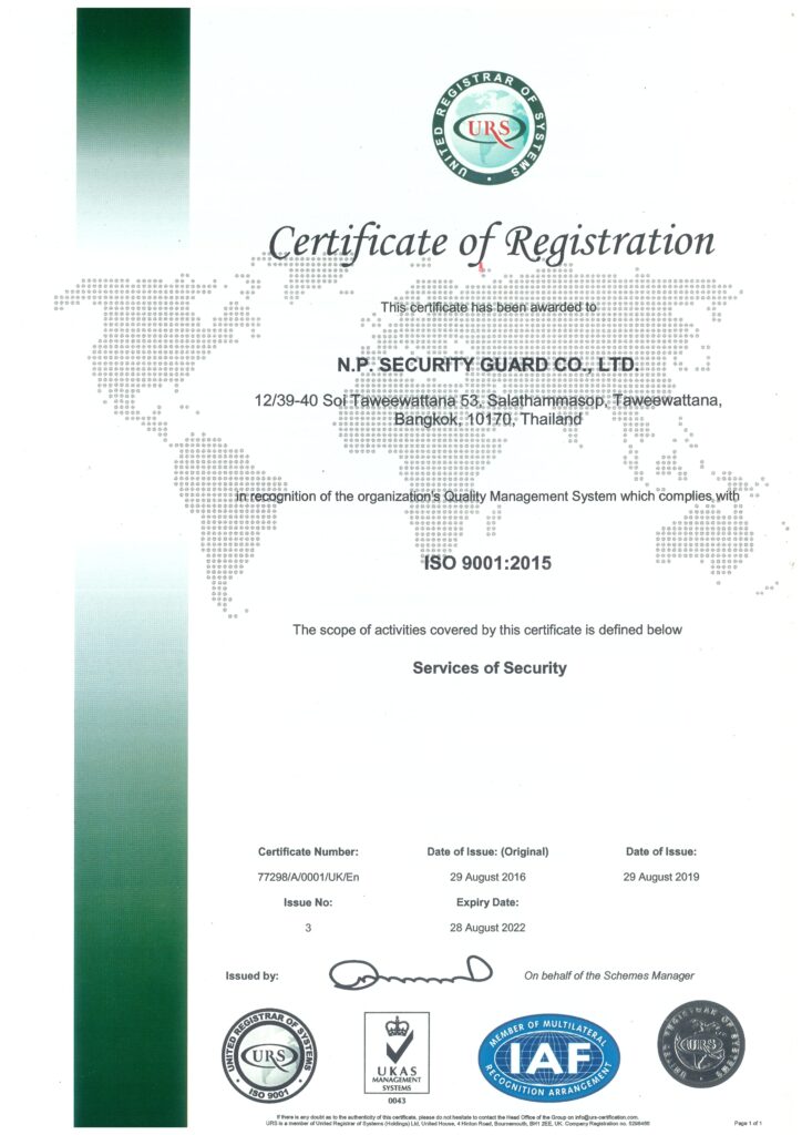 ได้รับการรับรอง ISO 9001 : 2015 ซึ่งเป็นเครื่องมือการบริหารงานที่สำคัญที่ทำให้เราก้าวไปสู่ความเป็นมาตรฐานสากล และเป็นบริษัทชั้นนำด้านการรักษาความปลอดภัยของประเทศ